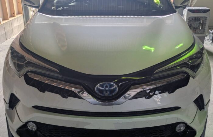 CH-Rに適合するフロントガラスを準備し、既存のガラスを丁寧に取り外しました。ボディ周辺をしっかり養生し、接着面を清掃・下地処理することで、ガラスを確実に装着できるよう施工しました。