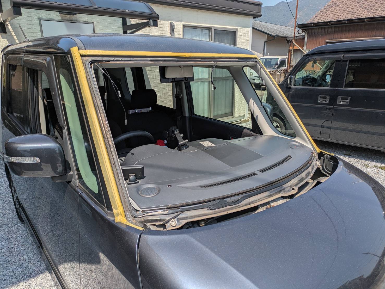 ワイパーやモールなどの部品を外し、破損したガラスを飛散させないよう慎重に取り外しました。